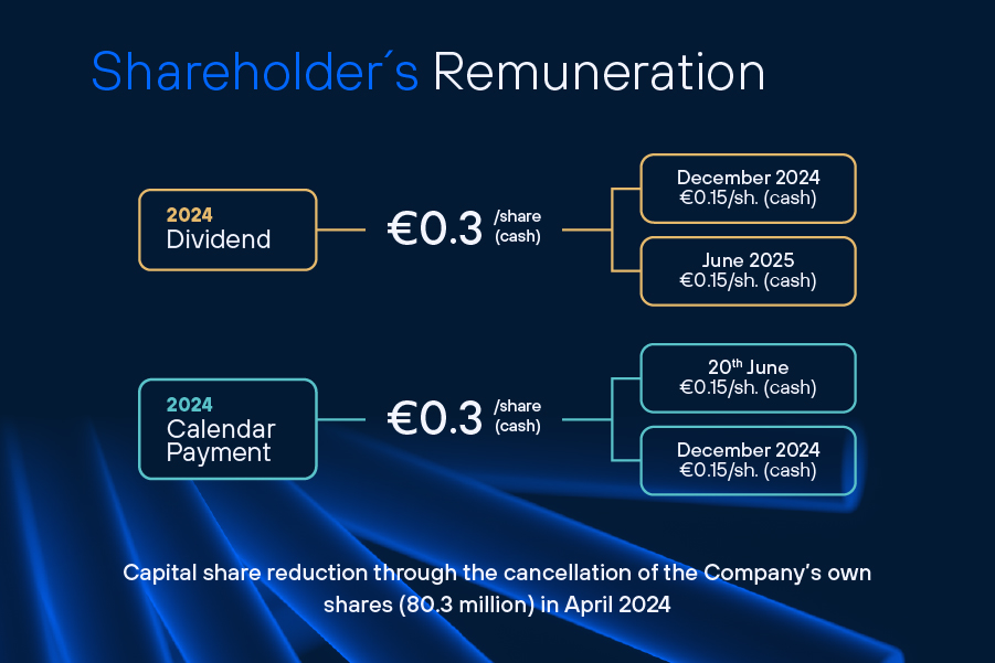 Telefónica Infra recorded a total of 23 million premises passed in June with the various existing fibre vehicles and more than 100,000 km of international connectivity via submarine cable. Telxius, the cable operator, continued to stand out for its high profitability ratio, with an EBITDA margin of 49.4% in the first half.